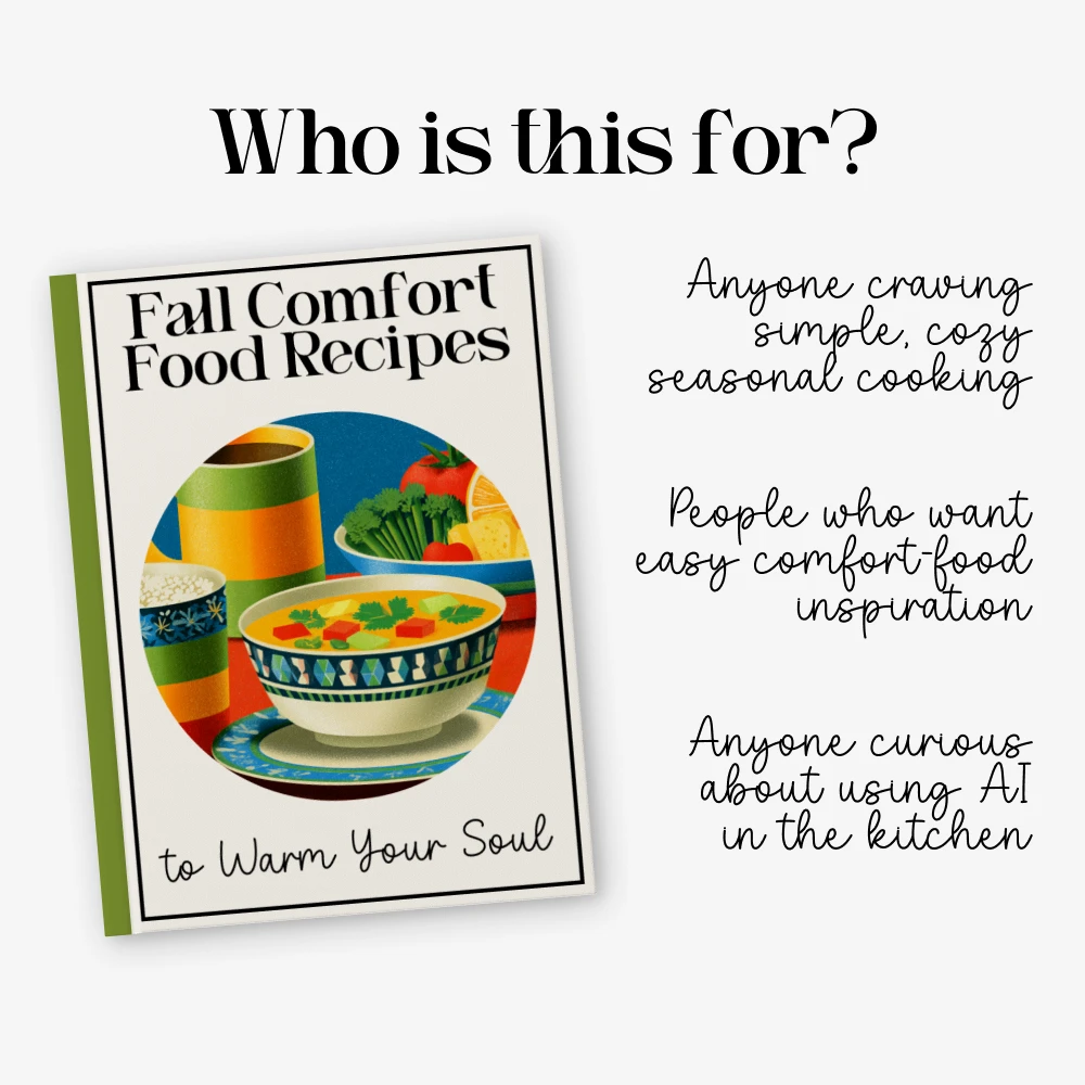 This eBook stands apart by blending classic comfort dishes with modern creativity—especially through its section on using free AI tools for recipe inspiration. It’s not just a recipe book; it’s a warm, encouraging guide for anyone who wants to make fall cooking easier, more delicious, and more fun.
