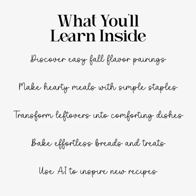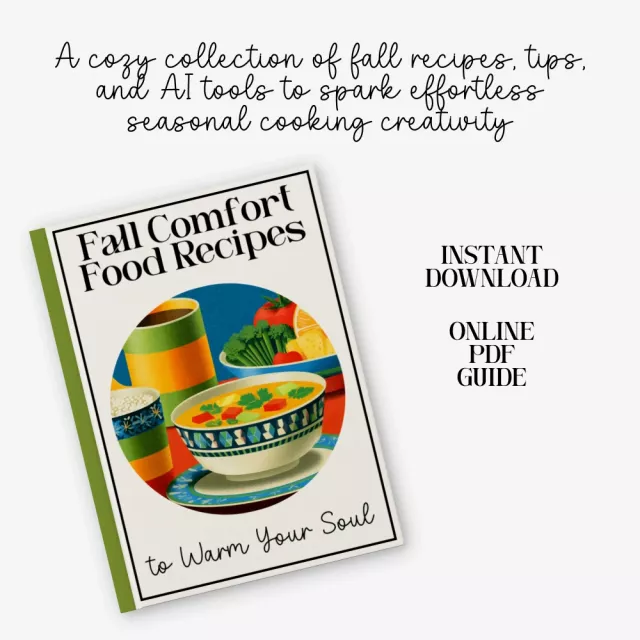 Inside this cozy, fall-inspired eBook, you’ll find a thoughtfully curated collection of seasonal cooking essentials—from pantry must-haves and spice guides to hearty soups, stews, mains, bakes, and desserts. Each section is designed to help you explore autumn’s richest flavors with confidence, while bonus chapters on AI-powered creativity give you fresh ways to spark new recipe ideas. Whether you’re whipping up quick weeknight meals or planning a comforting weekend feast, this guide offers everything you need to make fall cooking warm, simple, and endlessly inspiring.