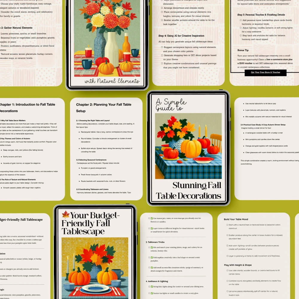 If you’re looking for cozy fall tablescape ideas that fit your style and budget, this bundle is the answer. Each guide and checklist has been thoughtfully crafted to help you create an inviting, fall-inspired atmosphere without feeling overwhelmed. You’ll find practical suggestions for using natural elements and budget-friendly decor, making it easy to transform your home into a cozy haven for any occasion.