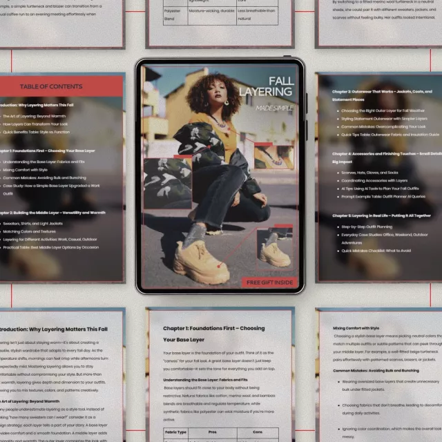 Unlike generic fashion advice, Fall Layering Made Simple combines clear structure, visual-friendly tables, and real-world examples. It focuses on practical application, not trends, making it a timeless resource you’ll reuse every fall.