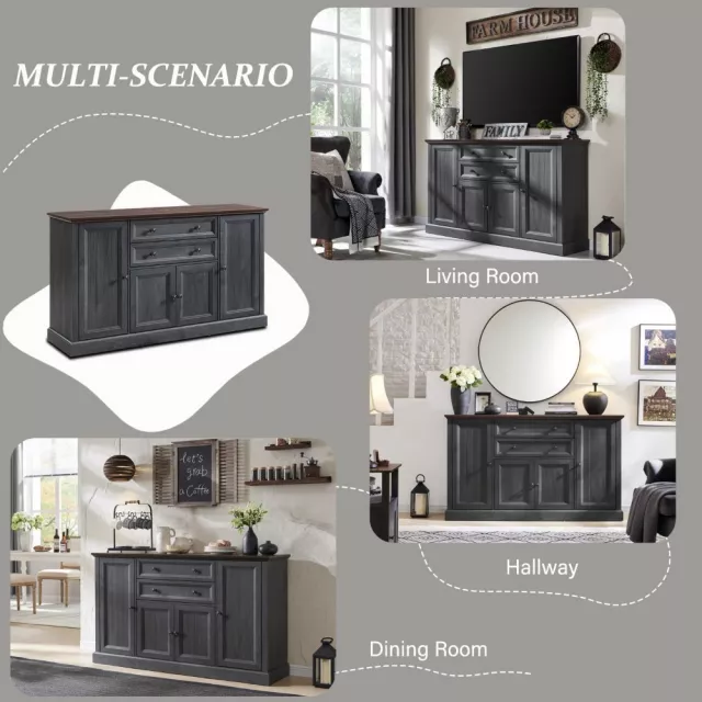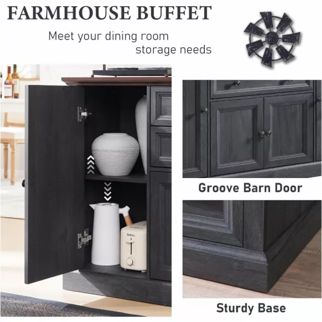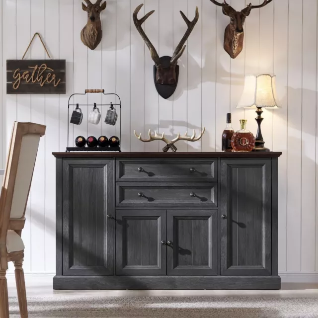 Bring a touch of cozy farmhouse style into your home with this beautifully crafted 58-inch Buffet Cabinet. Perfect as a coffee bar, dining room sideboard, or stylish storage unit, this cabinet is designed to make a statement while helping you stay organized. With a spacious tabletop, two deep drawers, and four grooved barn-style doors that open to adjustable shelving, it’s as practical as it is eye-catching. Whether you’re setting up your morning coffee station or showcasing your favorite tableware, this piece blends modern function with rustic character to suit your lifestyle.
