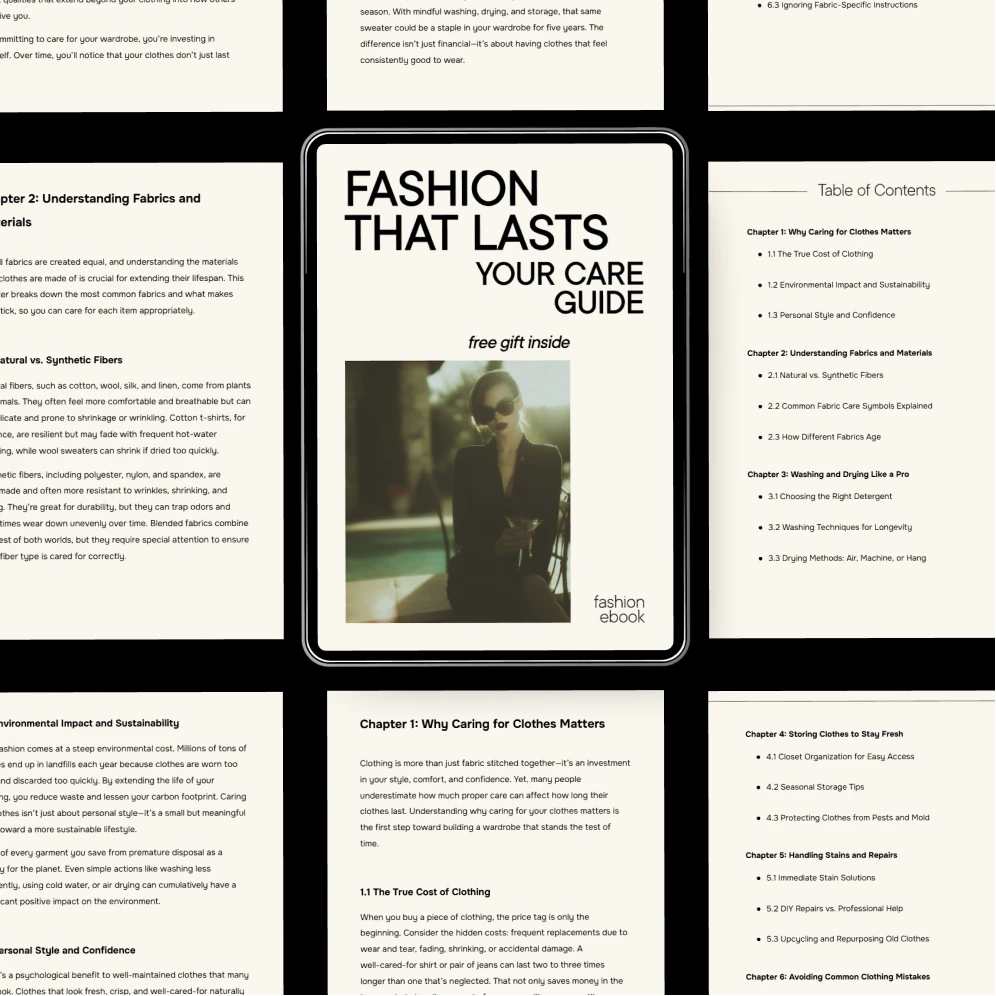 Fashion That Lasts: Your Care Guide is a practical, easy-to-follow digital resource designed to help you protect the clothes you already love. Instead of replacing worn pieces, this guide shows you how small, smart care habits can dramatically extend the life of your wardrobe. From washing and drying to storage, repairs, and even AI-powered tools, this eBook brings together modern solutions and timeless care techniques in one beautifully organized download.