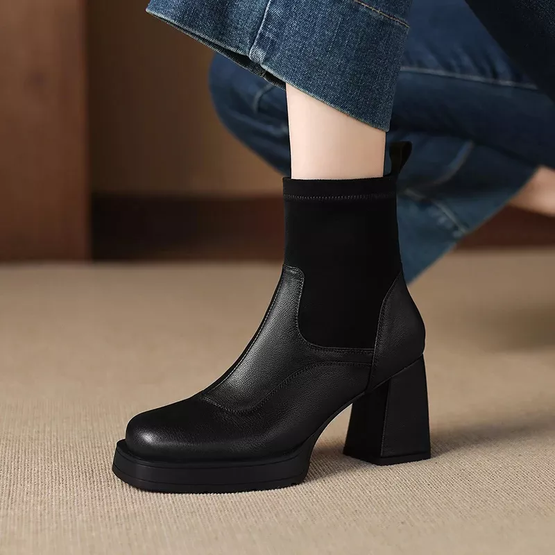 Winter Women’s Chunky Heel Leather Boots with Zipper