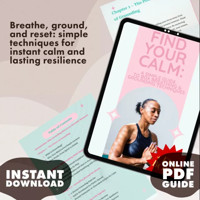 Bring peace back into your day with this instantly downloadable guide. Learn how to ground yourself, practice box breathing, and create a personalized calm routine. Download Find Your Calm: A Simple Guide to Box Breathing & Grounding Techniques today and start your journey from reaction to resilience.