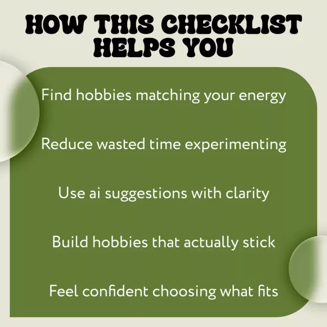 Unlike generic hobby lists, this checklist blends self-reflection with modern technology. It doesn’t tell you what to like. Instead, it teaches you how to use AI as a supportive tool while keeping your real feelings and experiences at the center. The result is hobbies that feel exciting, sustainable, and genuinely aligned with who you are.