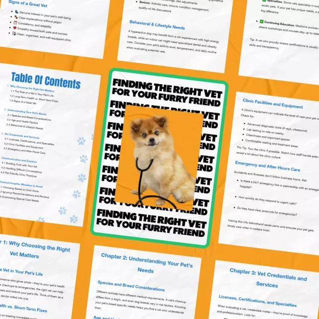Choosing the right veterinarian is one of the most important decisions you’ll make as a pet owner. “Finding the Right Vet for Your Furry Friend” is an in-depth eBook designed to guide you through every step of how to choose a vet who fits your pet’s unique needs. Whether you have a playful puppy, a curious cat, or a senior dog requiring specialized care, this digital guide equips you with the knowledge to make confident, informed choices that support your pet’s long-term health and happiness.