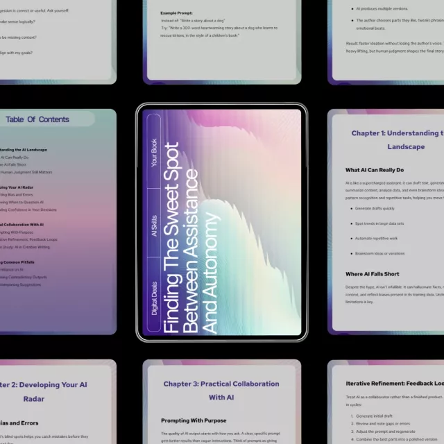 Step into the future of productivity and creativity with Finding the Sweet Spot Between Assistance and Autonomy—a digital eBook designed to help you understand how to balance AI help with your own judgment. Whether you’re a creator, entrepreneur, writer, or professional curious about the evolving world of artificial intelligence, this guide offers practical wisdom and real-world strategies to make AI your trusted co-pilot, not your replacement.