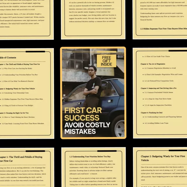 Unlike generic car buying advice, this ebook focuses specifically on common first car buyer mistakes and shows you how to avoid them before they happen. It blends real-life examples with clear explanations and modern AI tools, making complex decisions easier and less intimidating. The language is simple, the advice is actionable, and every chapter is built to save you money, time, and stress.