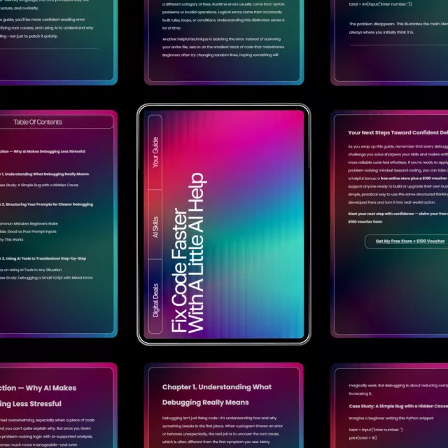 If you’ve ever stared at your screen wondering why your code won’t behave, this digital guide is your new secret weapon. Fix Code Faster with a Little AI Help shows you exactly how to use ai to debug simple code using clear prompts, real examples, and repeatable troubleshooting patterns. Designed for beginners and self-taught coders, this resource makes debugging feel less stressful and more intuitive by teaching you how to collaborate effectively with AI tools—so you can understand your errors, fix them quickly, and grow your confidence.