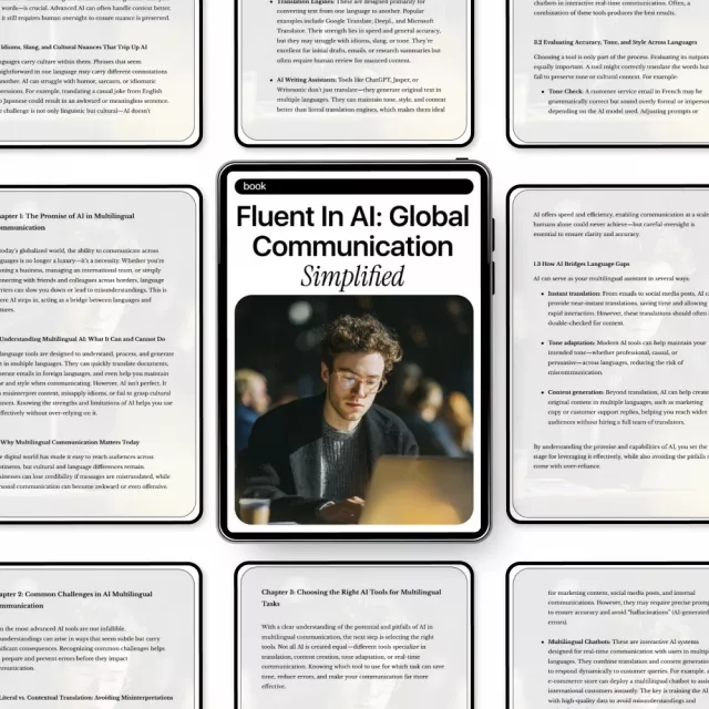 Struggling to communicate clearly across languages while using AI tools? Fluent in AI: Global Communication Simplified is a practical, easy-to-follow ebook designed to help you use AI with confidence in multilingual settings. Instead of vague theory, this guide shows you exactly how AI works with different languages, where it fails, and how to get better results fast. Whether you manage global teams, write marketing content, or support international customers, this ebook turns confusion into clarity.