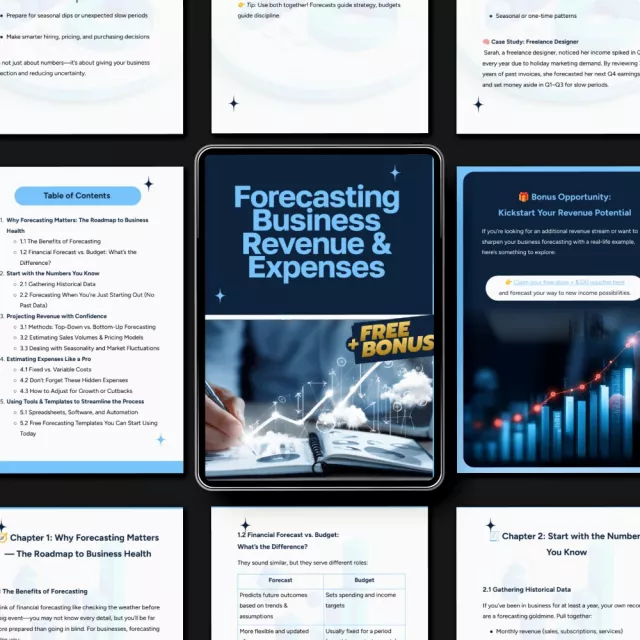Take the guesswork out of your business finances with Forecasting Business Revenue & Expenses, a practical and easy-to-follow ebook designed to help you understand how to forecast business revenue and expenses with clarity and confidence. Whether you’re a new entrepreneur or an experienced business owner, this digital guide walks you step-by-step through creating accurate financial forecasts that support smarter decisions, healthier cash flow, and sustainable growth.