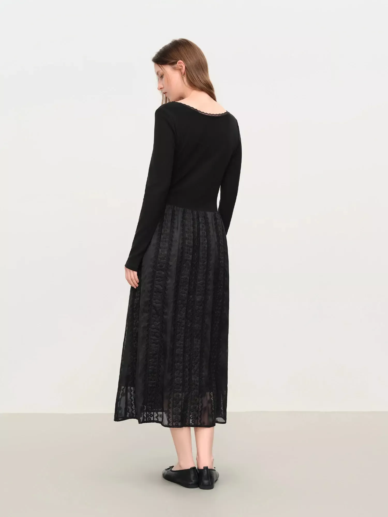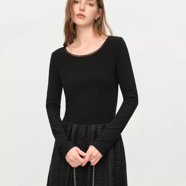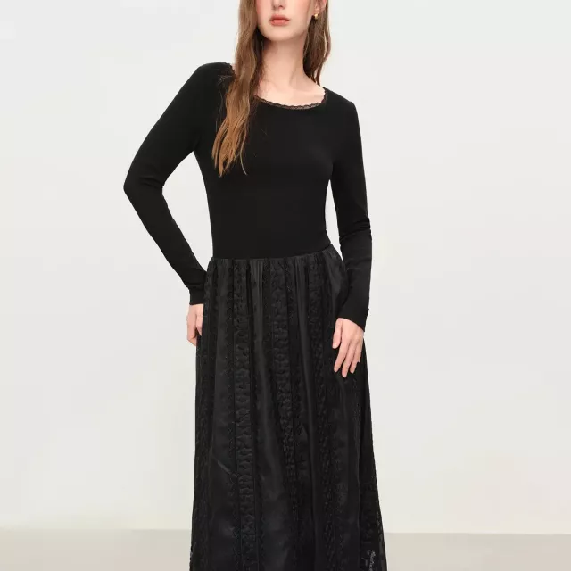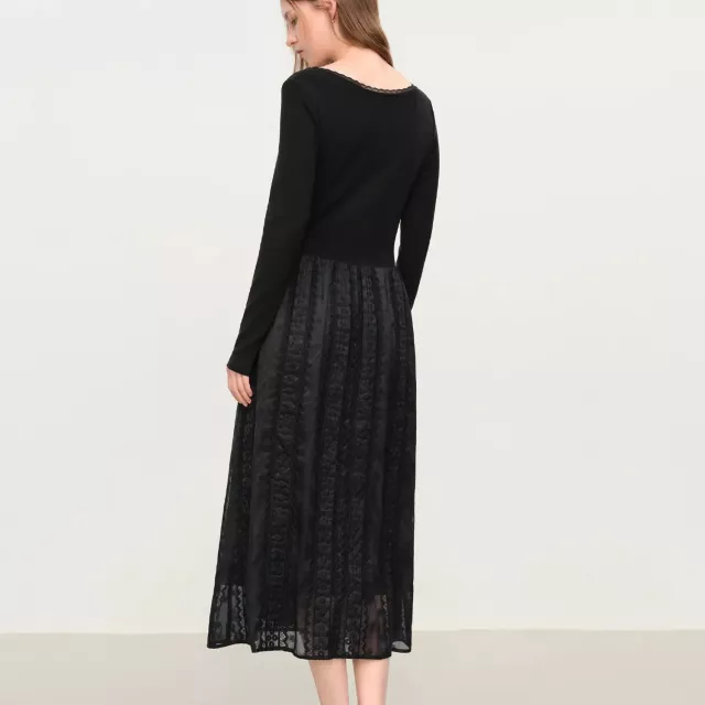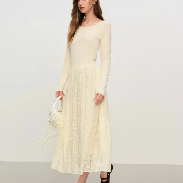 This dress stands out for its subtle elegance and thoughtful design. The embroidered lace detailing brings a soft, vintage feel, while the long sleeves make it perfect for cooler days. The structured yet comfortable knit fabric keeps its shape without feeling heavy, giving you a clean, graceful look every time you wear it. Its mid-calf length offers modest coverage while still feeling stylish and modern.