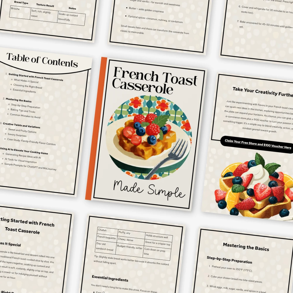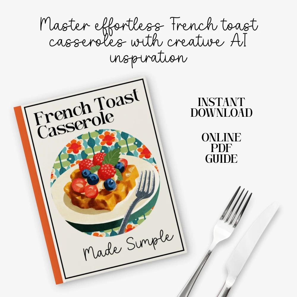 This digital download includes a complete french toast casserole recipe system, from beginner basics to creative variations. You’ll find clear explanations, ingredient guidance, prep timelines, and baking techniques, along with modern AI tools to help you generate personalized recipe ideas and visual inspiration.