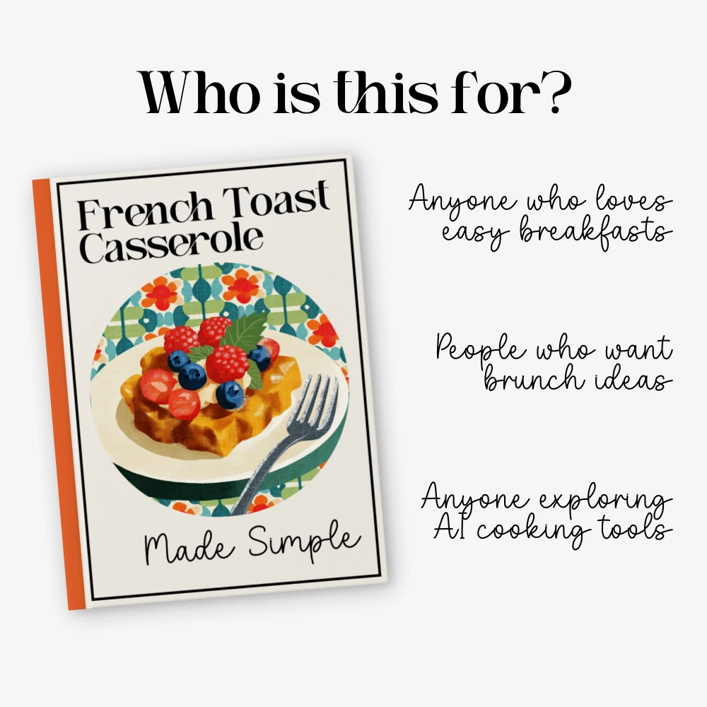 Unlike other recipe guides, French Toast Casserole Made Simple blends traditional cooking with modern technology. Not only do you get a foolproof french toast casserole recipe, but you also learn how to use AI tools like ChatGPT and MidJourney to create endless new flavor ideas and visual inspiration for your dishes. It’s a smart, future-focused guide that grows with your creativity.