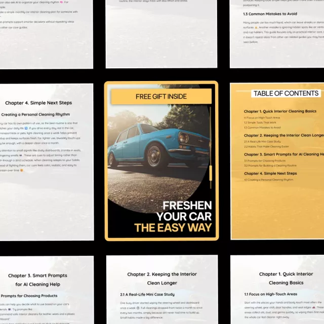Unlike other digital car cleaning resources, Freshen Your Car the Easy Way combines traditional cleaning tips with modern AI assistance. The inclusion of smart prompts for AI cleaning help makes it a unique tool to personalize your routine and make smarter product choices. With real-life examples and a focus on long-term habits, this guide ensures your car stays fresh longer, saving you time, money, and effort.