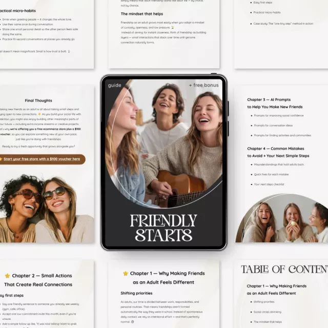 Friendly Starts is a warm, practical, and encouraging digital guide designed to help adults build genuine friendships in simple, manageable steps. Whether you’re navigating a new city, craving deeper social connections, or simply feeling unsure where to begin, this guide offers clarity, comfort, and direction. With relatable insights, actionable tips, and thoughtfully crafted AI prompts, it supports you in creating real connections without overwhelm or guesswork.