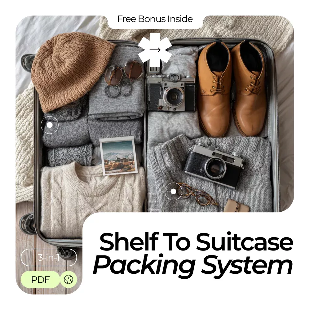 Transform your packing routine with the From Shelf to Suitcase Packing System. Download your essential toiletries packing guide bundle now and experience the freedom of traveling light, organized, and worry-free.