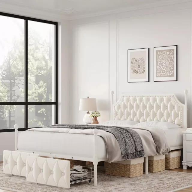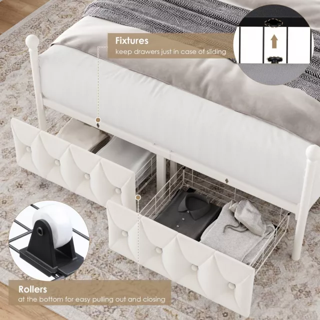 • Hidden Storage Drawers: Maximize your bedroom’s storage with two large hidden drawers on wheels. Perfect for storing blankets, pillows, or other essentials, these drawers help you keep your space organized and tidy.