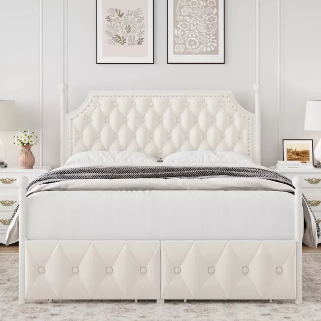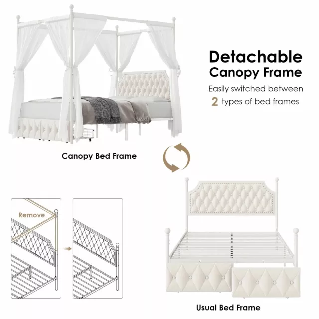 Full Size Upholstered Canopy Bed Frame with Storage Drawers