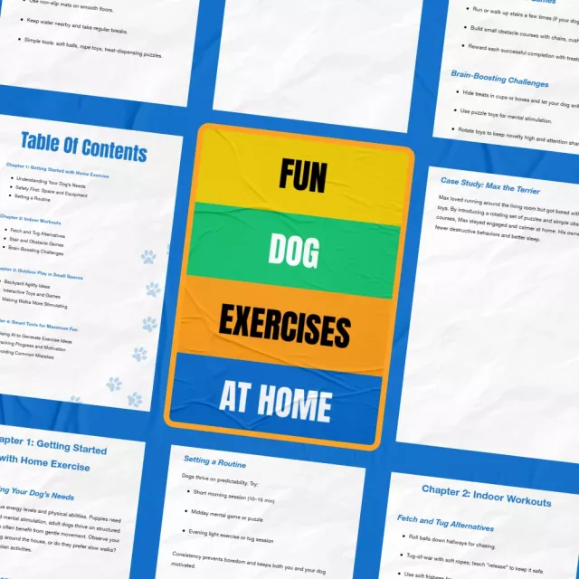 Keep your dog active and entertained without leaving the house with the Fun Dog Exercises at Home guide! This comprehensive eBook is packed with creative and practical dog exercise ideas at home, designed to keep your dog mentally and physically fit in any space. Whether you’re looking for indoor workouts or ways to make outdoor play more stimulating, this guide is your go-to resource for fun, safe, and effective exercises for dogs of all ages and activity levels. Download now and make every day an adventure for your dog!