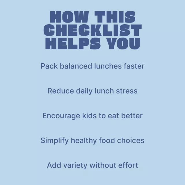 Unlike long recipe books or rigid meal plans, this checklist is flexible, visual, and easy to reuse. It empowers you to mix and match foods you already have at home while still creating balanced lunches. No complicated prep, no wasted food—just simple guidance that works in real life.
