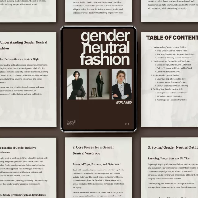 Unlike other resources, Gender Neutral Fashion Explained provides a practical, step-by-step approach to building a wardrobe that reflects your unique identity. The guide goes beyond theory, offering actionable tips, a deep dive into color, texture, and pattern choices, as well as expert advice on layering and styling. Plus, with its inclusion of AI tools for outfit inspiration and real-world case studies, this guide is more than just a fashion reference—it’s a tool to help you discover your style.