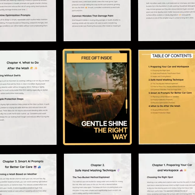 Gentle Shine the Right Way – Safe Hand Washing Guide, Scratch-Free Car Wash eBook, Paint Protection Checklist, Smart AI Prompts for Better Car Care