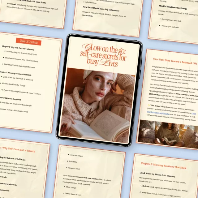 Life moves fast, and taking care of yourself often feels like the first thing to fall off the list. Glow on the Go: Self-Care Secrets for Busy Lives is a thoughtfully designed digital ebook created to help you feel energized, confident, and grounded, even on your busiest days. This guide proves that self-care doesn’t require hours of free time or complicated routines. With realistic strategies you can use anywhere, this ebook helps you build healthy habits that actually fit into real life.