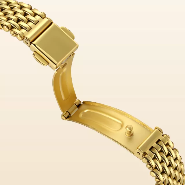 This watch isn’t just about telling time—it’s a statement piece. Its ultra-thin 0.27 in case profile gives it a refined and modern appeal, while the full-gold tone radiates luxury without being overpowering. The detachable bracelet allows easy adjustment for a perfect fit, making it as practical as it is stylish. With water resistance up to 100 ft, it’s built to withstand everyday splashes while keeping its elegant allure intact.