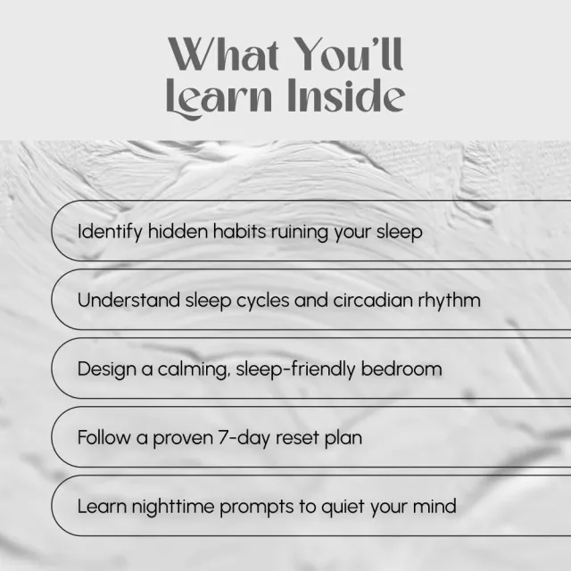 • Chapter 4: From Restless to Rested—Your 7-Day Sleep Reset – Follow a gentle, results-driven reset plan, with actionable nightly prompts and advice to help you sustain healthy sleep long-term.