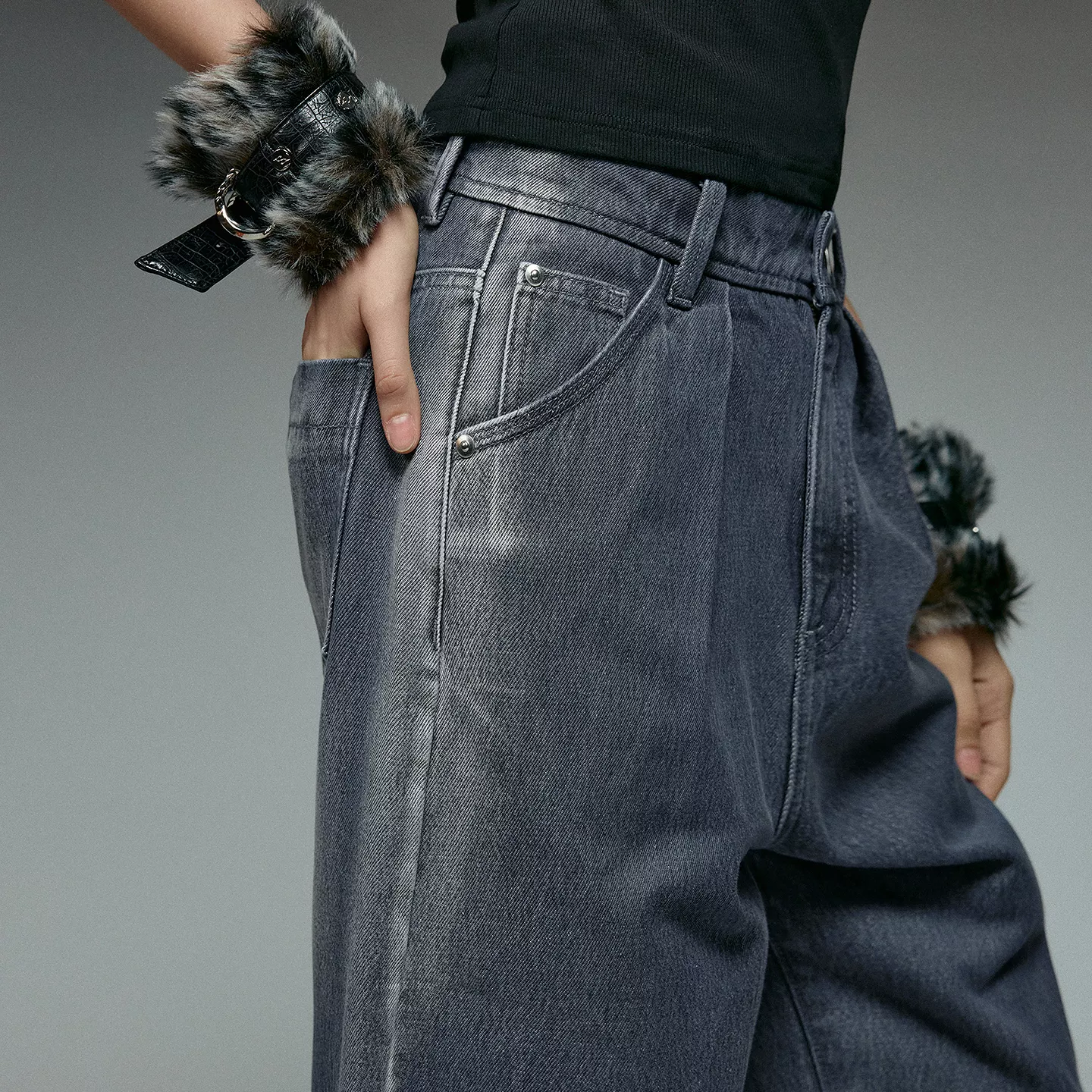 What sets these apart is the blend of a bold banana cut and a soft gray tone. The shape adds visual interest and a fashion-forward feel, while the neutral color keeps them versatile. Unlike overly rigid denim, the premium cotton fabric softens with time while maintaining its form, giving you that perfect broken-in look without losing structure.