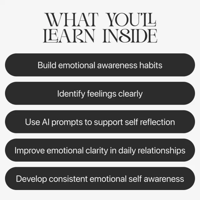 This digital download includes a structured, beginner-friendly emotional awareness guide that blends science and self-reflection. Inside, you’ll find clear explanations, real-life examples, practical exercises, and an exclusive section on Using AI tools for reflection to support your emotional growth. The guide also includes modern journaling techniques, reflective questions, and actionable routines for daily practice.