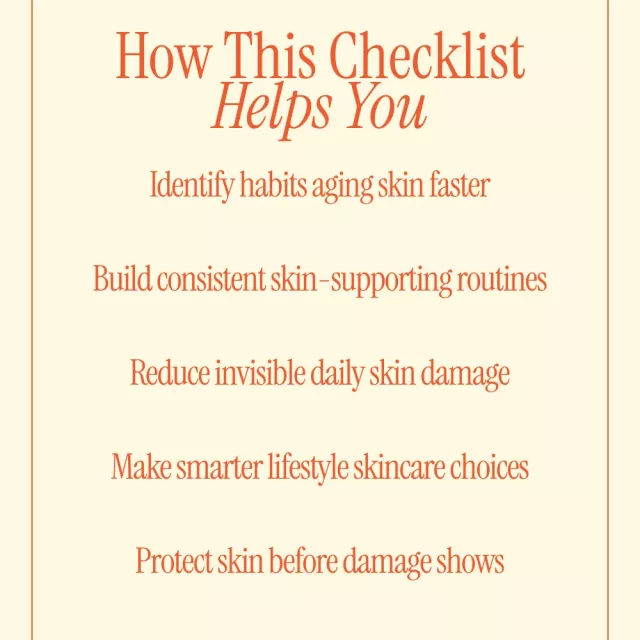 This checklist is ideal for anyone curious about what habits age skin faster, whether you’re just starting your skincare journey or already investing in treatments and products. It’s especially helpful for busy individuals who want clearer guidance without adding more steps to their routine.