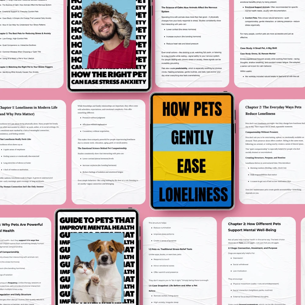 • Guide to Pets That Improve Mental Health: An in-depth eBook that explores the mental health benefits of various pets, from dogs to rabbits, and how to choose the right one for you.