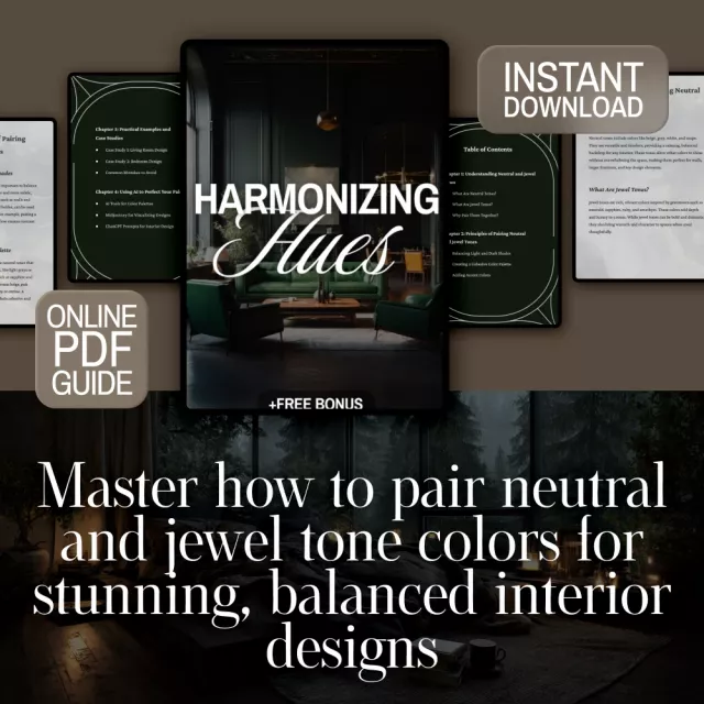 Discover the art of blending timeless neutrals with striking jewel tones in Harmonizing Hues, a digital guide designed to make interior design feel easy and inspiring. Whether you’re decorating your first apartment, refreshing a single room, or styling a client’s home, this resource will show you exactly how to pair neutral and jewel tone shades for a polished and elevated look. With practical tips, real-life case studies, and AI-powered tools, this guide helps you turn bold ideas into beautifully cohesive designs.