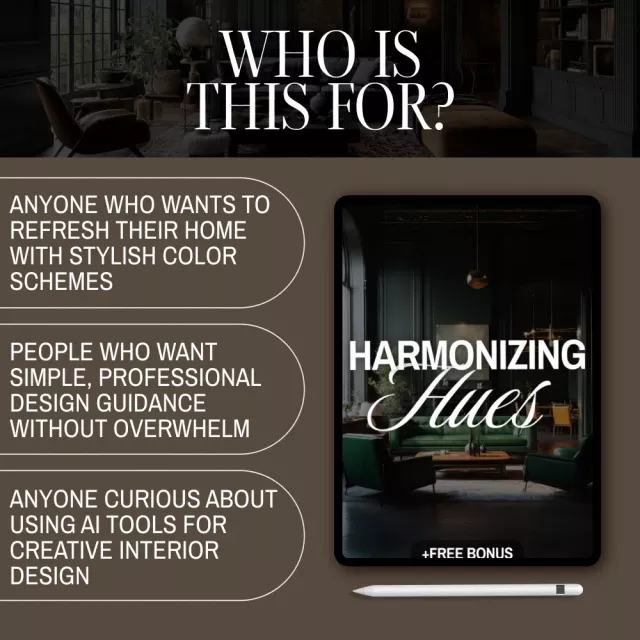 Unlike generic color guides, Harmonizing Hues combines timeless design principles with modern AI tools to give you both inspiration and execution power. You’ll not only understand why neutrals and jewel tones work so well together, but you’ll also gain practical, hands-on steps to bring your vision to life confidently.