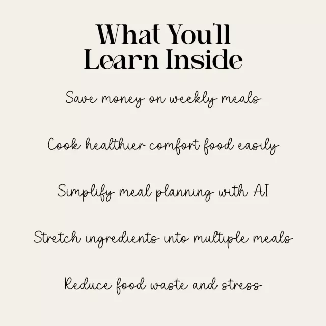 Unlike generic recipe eBooks, this guide blends budget cooking, health-focused comfort meals, and modern AI tools in one complete system. You don’t just get recipes. You get strategies, repeatable systems, and smart planning prompts that help you build long-term habits and make your kitchen more affordable and efficient for life.