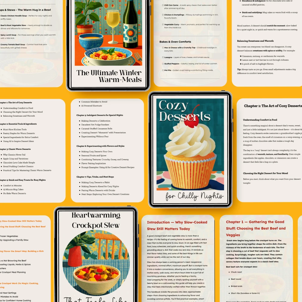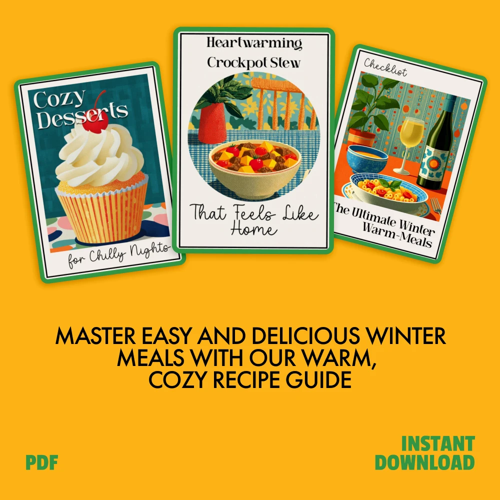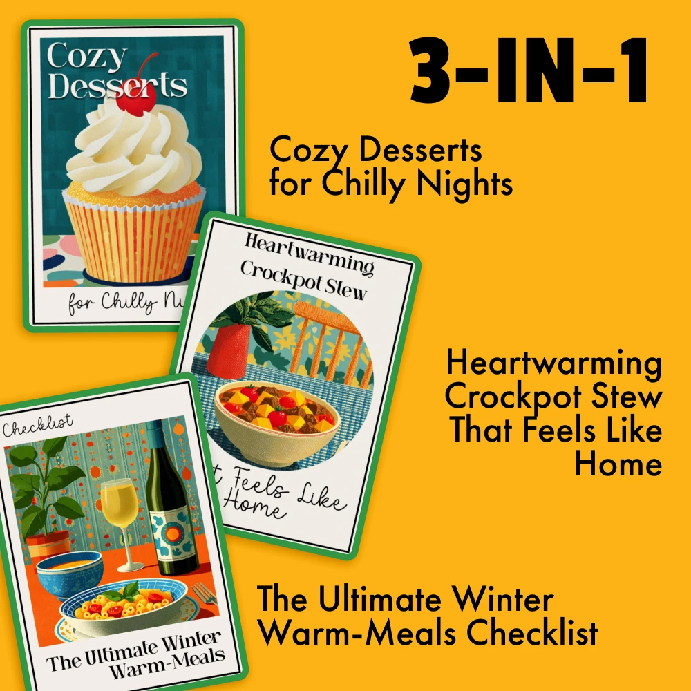 This all-in-one bundle includes three expertly crafted digital downloads: Cozy Desserts for Chilly Nights, Heartwarming Crockpot Stew That Feels Like Home, and The Ultimate Winter Warm-Meals Checklist. With easy-to-follow recipes and practical tips, you’ll be able to create mouthwatering meals in no time, perfect for the coldest days of the year.