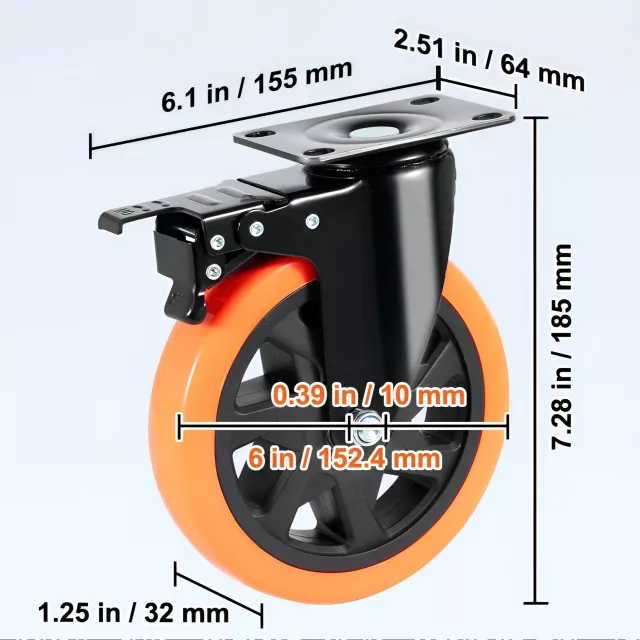 Constructed with reinforced carbon steel and thickened PVC, these caster wheels are built to last. Each wheel in this set of four can collectively hold up to 600 lbs, so you can move heavy furniture or equipment with ease. The dual brake system provides added security, letting you lock the wheels in place whenever needed, ensuring safety for both people and cargo.