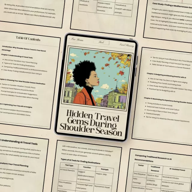 This eBook is perfect for explorers, digital nomads, solo travelers, couples, and anyone who wants to see more of the world with less stress. Whether you’re planning a quick getaway or a long journey, you’ll discover how ai to find destinations in shoulder season can help you travel more intentionally, confidently, and affordably.