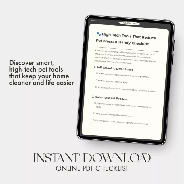 Love your furry friends but tired of constant cleanup? The High-Tech Tools That Reduce Pet Mess: A Handy Checklist is your must-have digital guide to a cleaner, smarter, and happier pet-friendly home. This downloadable checklist highlights innovative, time-saving gadgets that help you manage fur, odors, spills, and clutter effortlessly. Whether you’re a proud cat parent or a devoted dog lover, you’ll discover exactly what high tech tools reduce pet mess—so you can spend less time cleaning and more time cuddling.