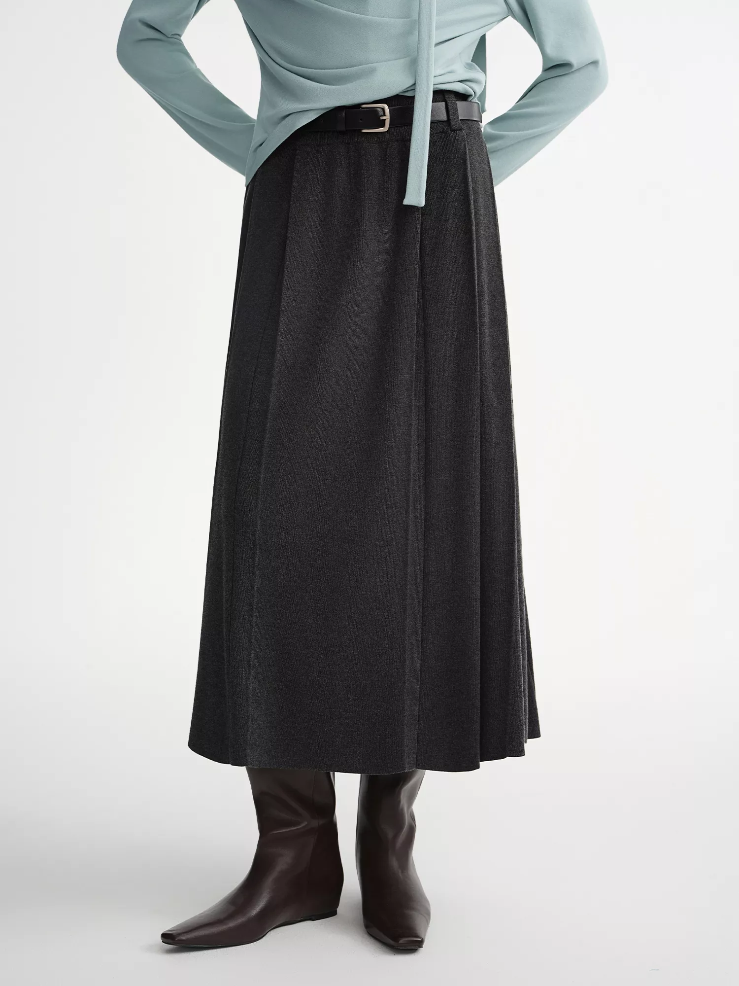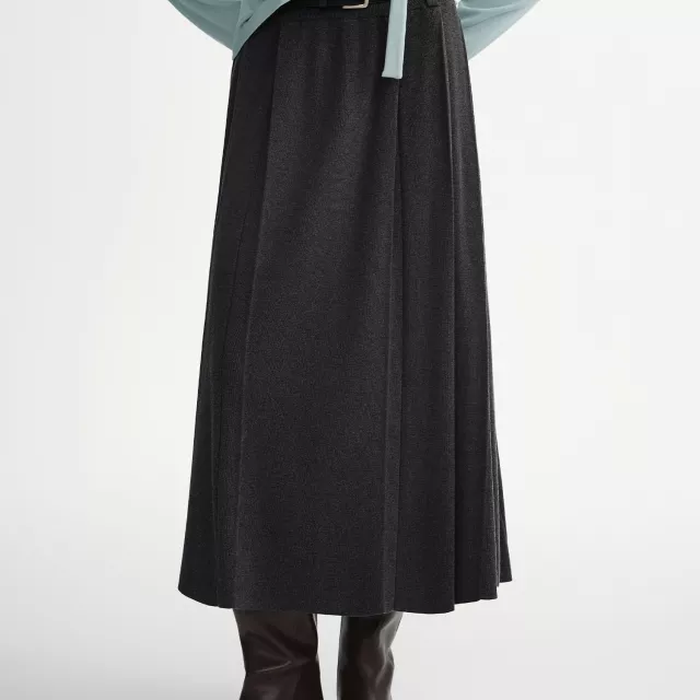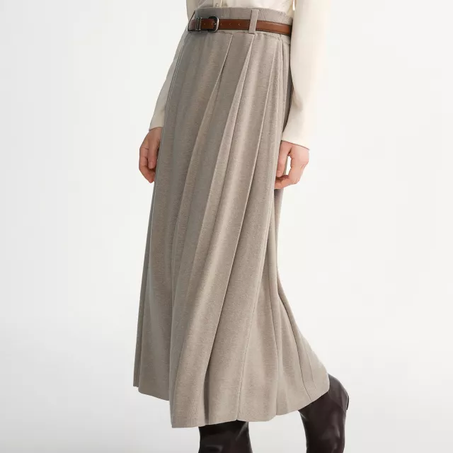 This skirt stands out because of its structured yet soft knit that holds its shape without feeling stiff. The pleated design adds texture and movement, while the natural high waist enhances your silhouette for a sleek, slimming look. Its ankle-length cut offers coverage and elegance, ideal for chilly days without sacrificing style.