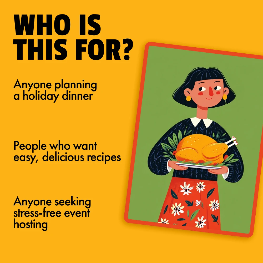 The Holiday Dinner-Party System is perfect for anyone looking to plan a holiday season menu with ease. Whether you’re an experienced cook or a beginner, these guides, checklists, and recipes will elevate your hosting game. It’s ideal for people who want to create memorable meals, entertain effortlessly, and bring joy to the holiday season.