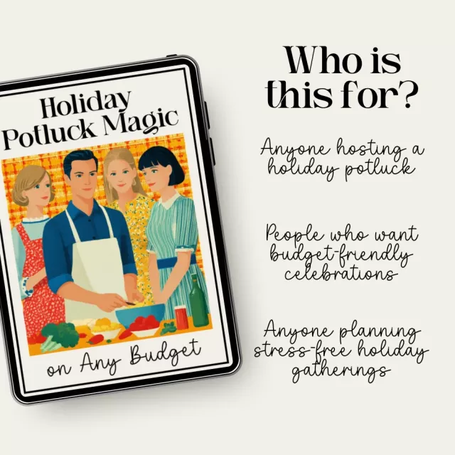 If you’re ready to stop stressing and start enjoying the holidays, Holiday Potluck Magic on Any Budget is your go-to guide. Click purchase, download your copy, and discover how to build a budget-friendly holiday potluck menu that wows your guests without draining your wallet.