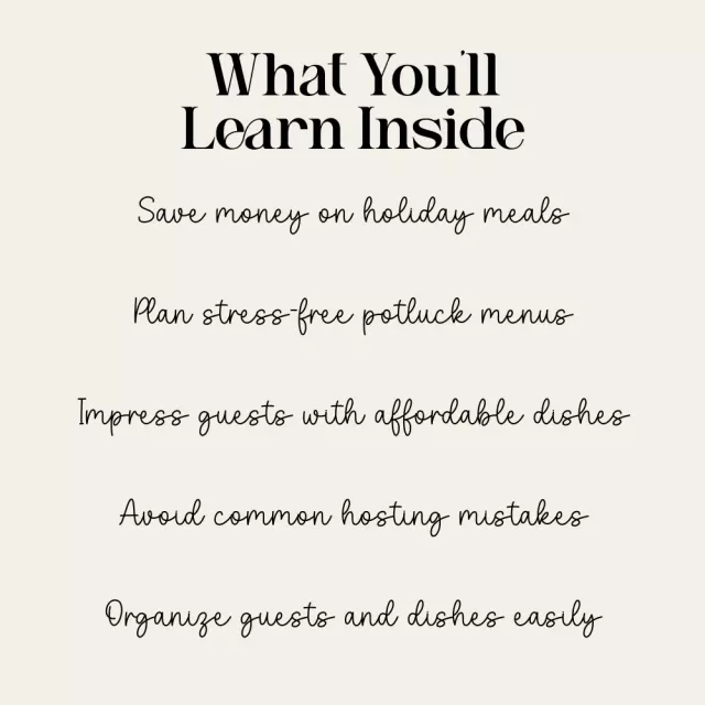 Unlike generic holiday cookbooks, this ebook focuses specifically on how to build a budget-friendly holiday potluck menu while also covering real-life challenges like guest coordination, limited funds, last-minute changes, and stress management. It combines planning, budgeting, recipes, and hosting into one simple system that actually works in real homes with real budgets.