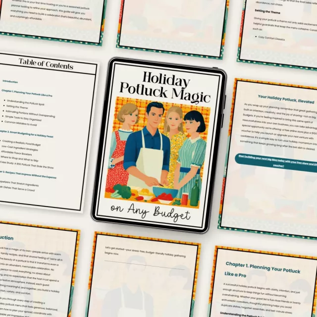 Hosting a holiday potluck should feel magical, not stressful or expensive. Holiday Potluck Magic on Any Budget is a beautifully written, practical digital ebook that shows you exactly how to build a budget-friendly holiday potluck menu without sacrificing flavor, style, or fun. Whether you’re feeding 5 guests or 50, this guide walks you step-by-step through planning, budgeting, cooking, and hosting with confidence—even if you’re working with limited time and money.