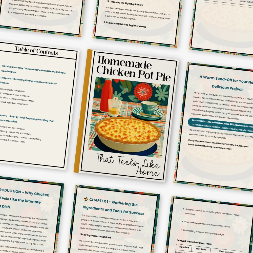 Unlike generic recipe PDFs, this guide is structured like a mini cooking course. You’re not just given instructions—you’re taught the logic behind each step. With technique comparison tables, real problem-solving examples, and even tips on using AI tools for kitchen organization, this guide goes far beyond basic directions on how to make homemade chicken pot pie.