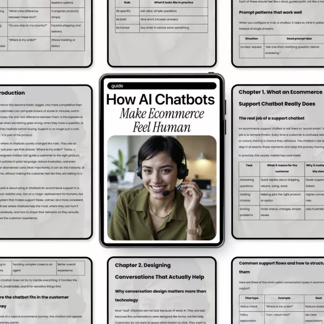 Most resources focus on chatbot tools. This guide focuses on how customers experience conversations. You’ll learn how to avoid dead ends, reduce frustration, and turn support interactions into trust-building moments that naturally support sales. Everything is written in plain language, with examples that apply to real ecommerce stores.