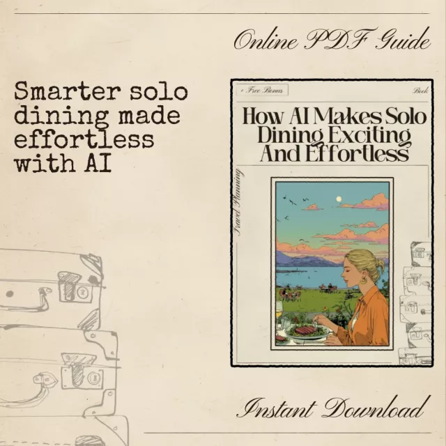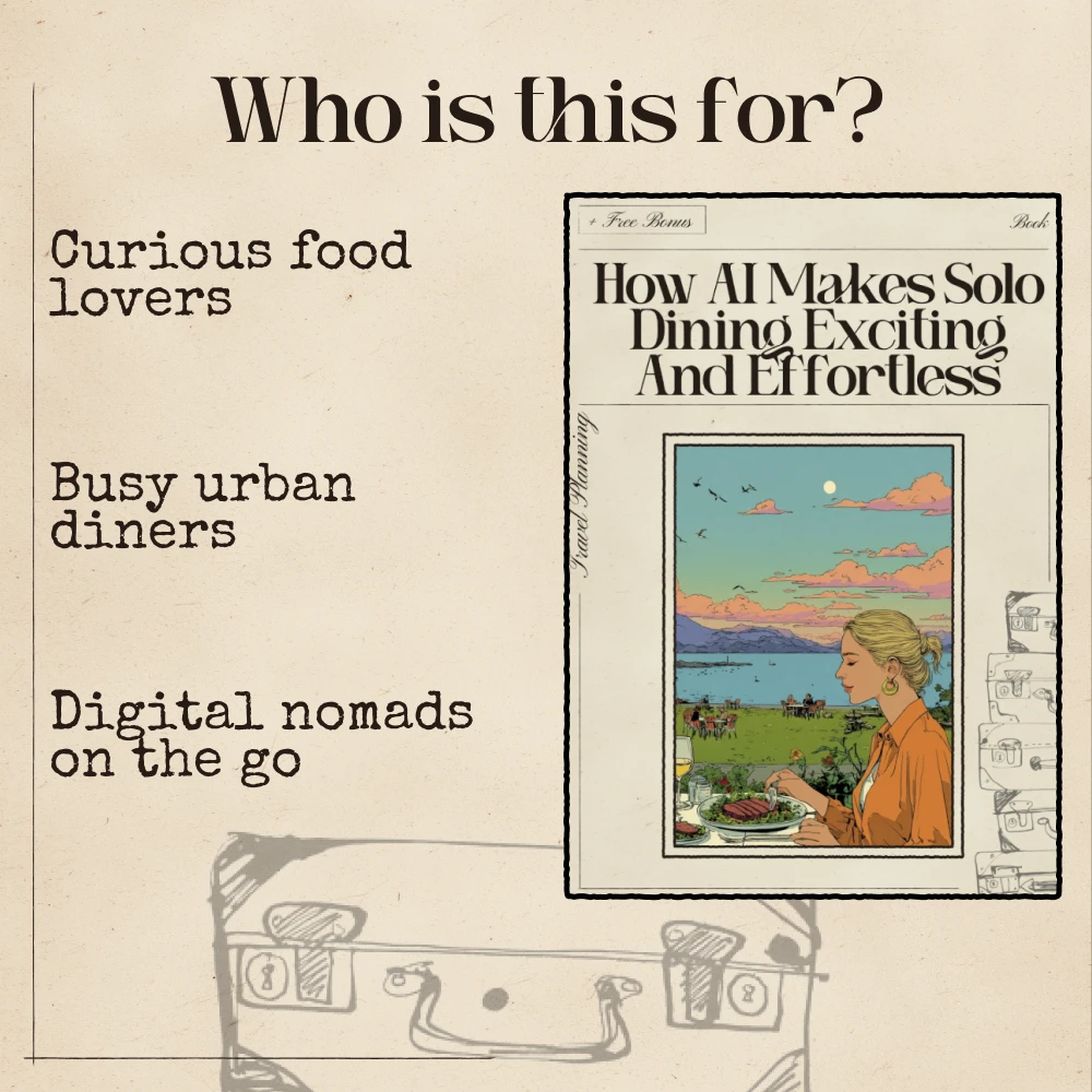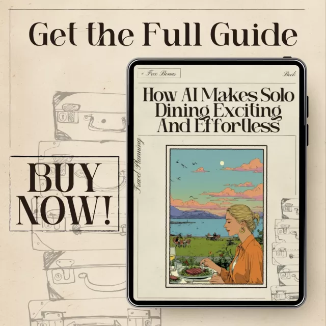 Unlike generic dining guides, this eBook combines technology with lifestyle insight, helping you understand not just where to eat but how to make every solo meal enjoyable. It’s practical, inspiring, and grounded in real AI tools that anyone can use — no tech expertise required.