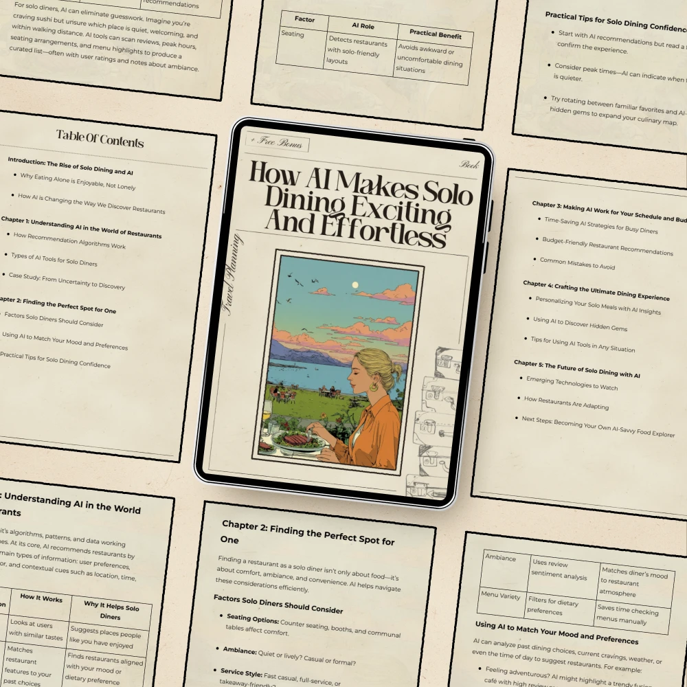 Transform the way you explore food and flavor with How AI Makes Solo Dining Exciting and Effortless — a digital eBook designed to empower independent eaters and curious travelers. Whether you love discovering new restaurants or simply want to make solo dining more fun and fulfilling, this guide shows you how to use ai for solo dining restaurant recommendations to uncover hidden gems, match your mood to the perfect meal, and create memorable dining moments on your own terms.